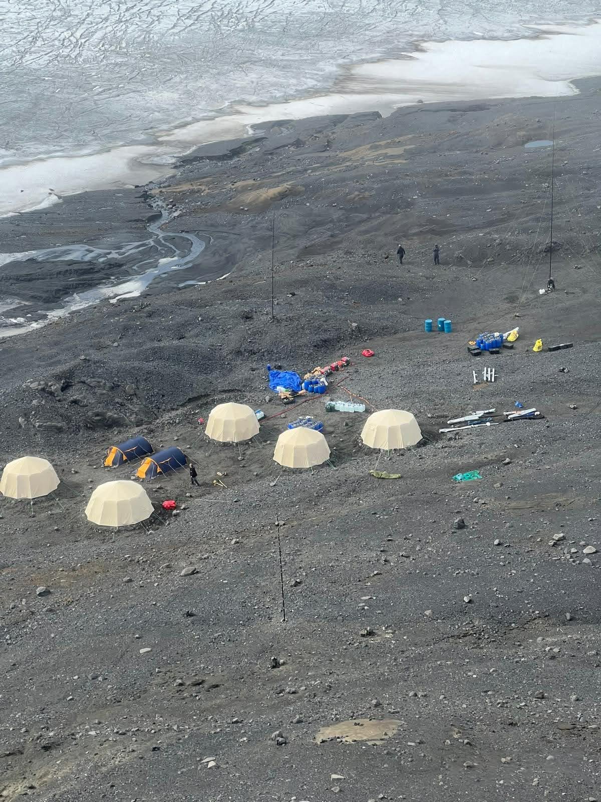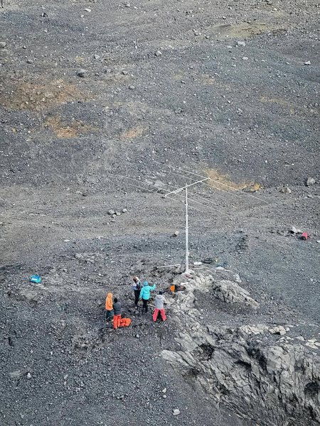 Síðan mátti bíðast eftir betri veðri og at tyrlan kom við meira fólki. Nú vóru teir 10 mans, hetta gjørdi tað lættari at fáa sett teltini upp. Teir fingu trý stór og tvey minni telt upp. Seinni komu 4 mans afturat, so nú var hópurin komin upp á 14.