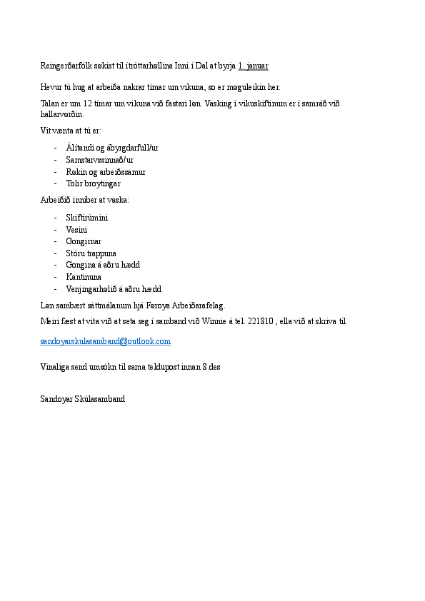 Reingerðarfólk søkist til ítróttarhøllina Inni í Dal at byrja 1. januar