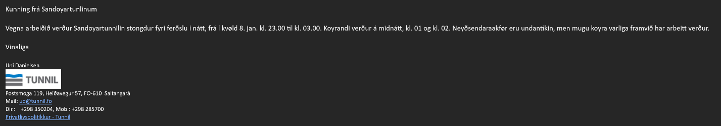 Vegna arbeiðið verður Sandoyartunnilin stongdur fyri ferðslu í nátt, frá í kvøld 8. jan. kl. 23.00 til kl. 03.00. Koyrandi verður á midnátt, kl. 01 og kl. 02. Neyðsendaraakfør eru undantikin, men mugu koyra varliga framvið har arbeitt verður.